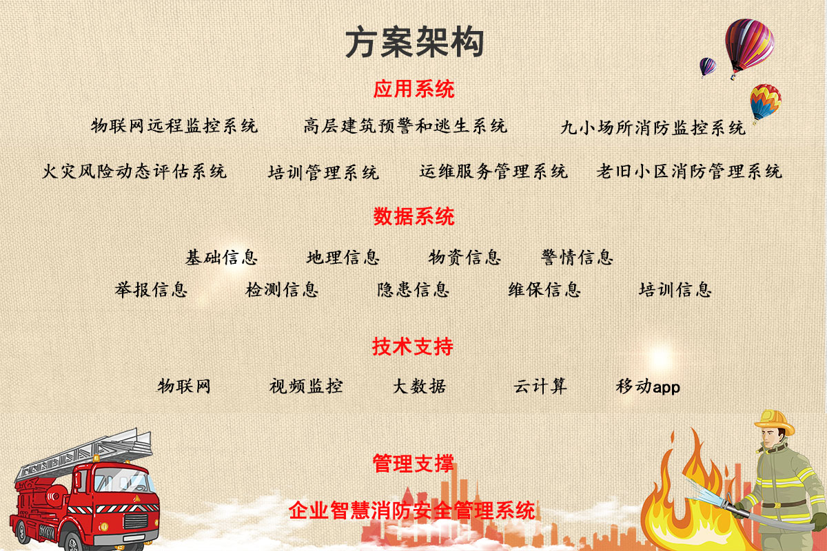 建設(shè)物聯(lián)網(wǎng)消防遠程監(jiān)控系統(tǒng)和智能預(yù)警系統(tǒng),實現(xiàn)動態(tài)感知、智能研判、精準防控,為消防提供信息支持。